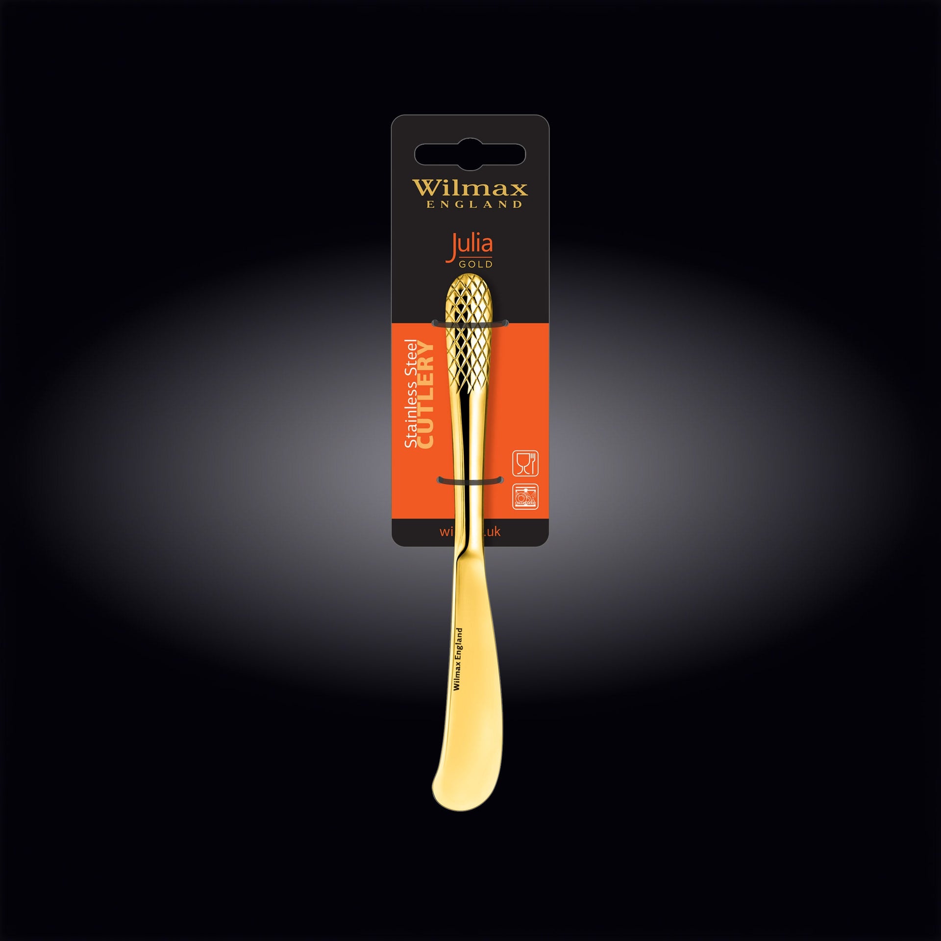 Das Wilmax Butter Knife bietet eine gelungene Kombination aus Ästhetik und Funktionalität. Die goldene Edelstahloptik macht es zu einem edlen Highlight auf jedem gedeckten Tisch. Ideal für den täglichen Gebrauch oder besondere Anlässe.