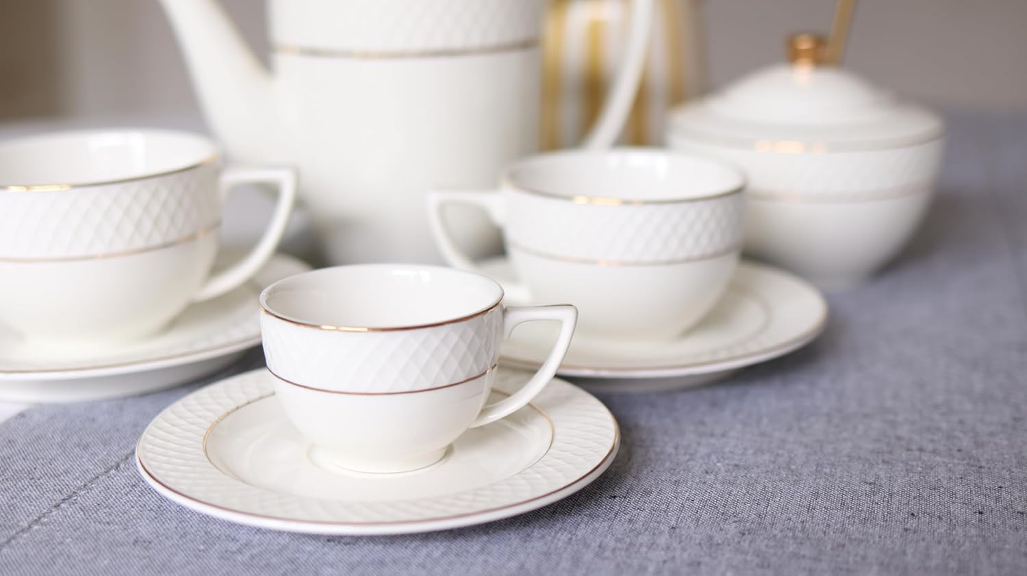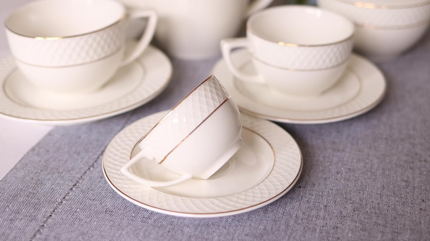 - Material: Hochwertiges Porzellan mit Goldlinien