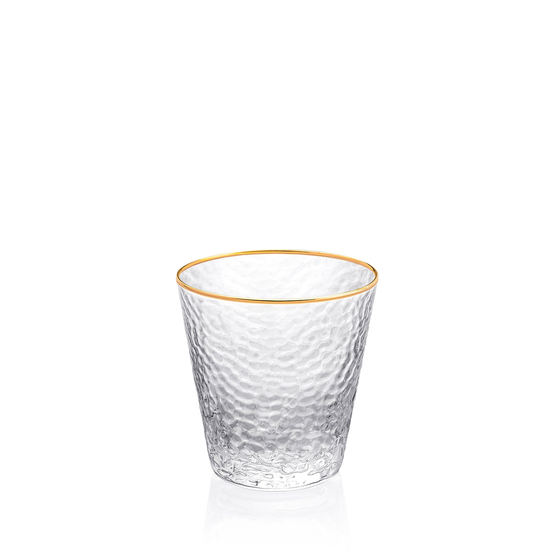 Das Wilmax Gold Rim Glass aus der Hammered Kollektion verbindet stilvolles Design mit praktischen Eigenschaften. Das runde Glas mit 300 ml Fassungsvermögen ist ideal für Cocktails, Wasser und andere Getränke.