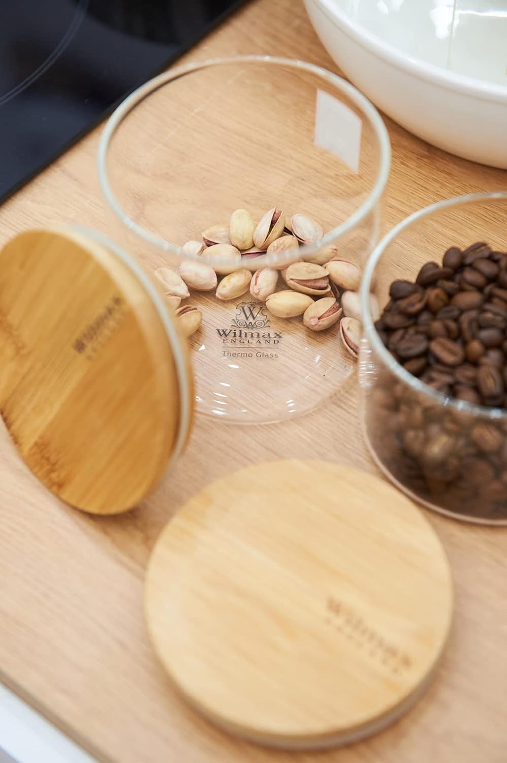 Das Wilmax Vorratsgläser Set kombiniert modernes Design mit praktischer Funktionalität. Die Gläser bestehen aus hochwertigem, hitzebeständigem Borosilikat Glas, das eine klare Sicht auf den Inhalt bietet. Die Bambusdeckel schließen dank einer Silikondichtung fest und luftdicht ab, sodass Lebensmittel länger frisch bleiben.
