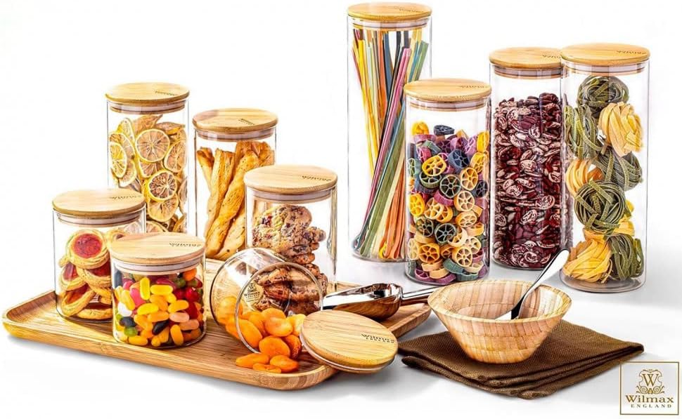 Das Wilmax Vorratsgläser Set bietet eine elegante und praktische Lösung für die Lebensmittelaufbewahrung. Mit ihren luftdichten Bambusdeckeln und dem klaren Design sorgen diese Gläser für Ordnung und einen ästhetischen Look in der Küche.