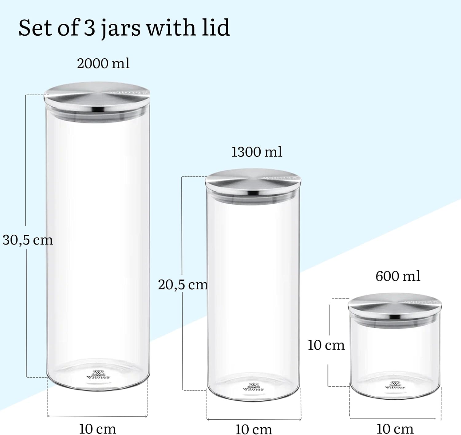 Die drei Größen (600 ml, 1300 ml, 2000 ml) eignen sich ideal zur Aufbewahrung von trockenen Lebensmitteln wie Müsli, Nudeln, Nüssen, Kaffee oder Keksen.