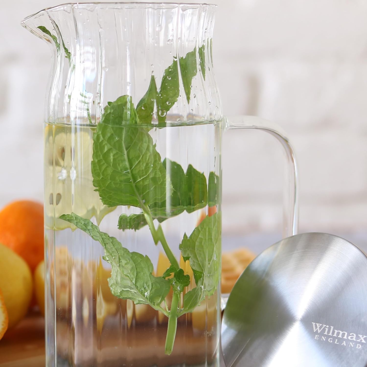 Die Wilmax Glaskaraffe WL-888220/A kombiniert ein modernes Design mit hoher Funktionalität. Hergestellt aus hitzebeständigem Borosilikatglas, eignet sie sich für heiße und kalte Getränke. Der Edelstahl-Deckel schützt den Inhalt und erleichtert das tropffreie Ausgießen.