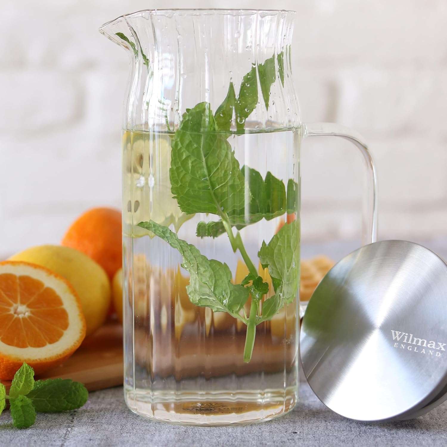Das Wilmax Set WL-888219/A-888623/A6 ist eine elegante Kombination aus einem hochwertigen Glaskrug (1000 ml) mit Edelstahl-Deckel und 6 passenden Gläsern (200 ml).
