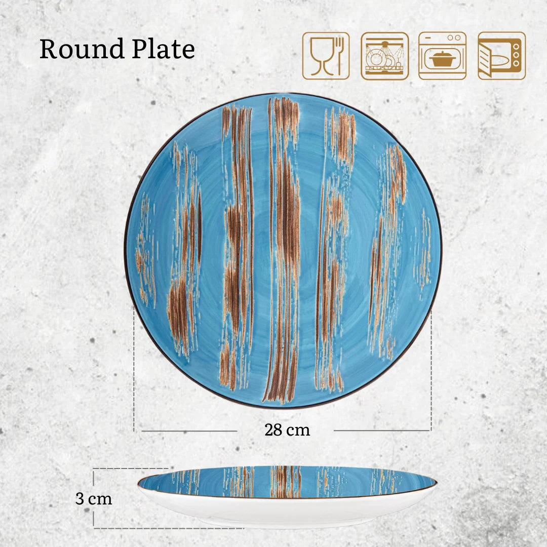Mit seinem Durchmesser von 28 cm eignet sich dieser Teller ideal für Hauptspeisen, Vorspeisen oder Desserts. Die blaue Farbgebung verleiht dem Teller eine moderne und frische Optik, die jeden gedeckten Tisch aufwertet.