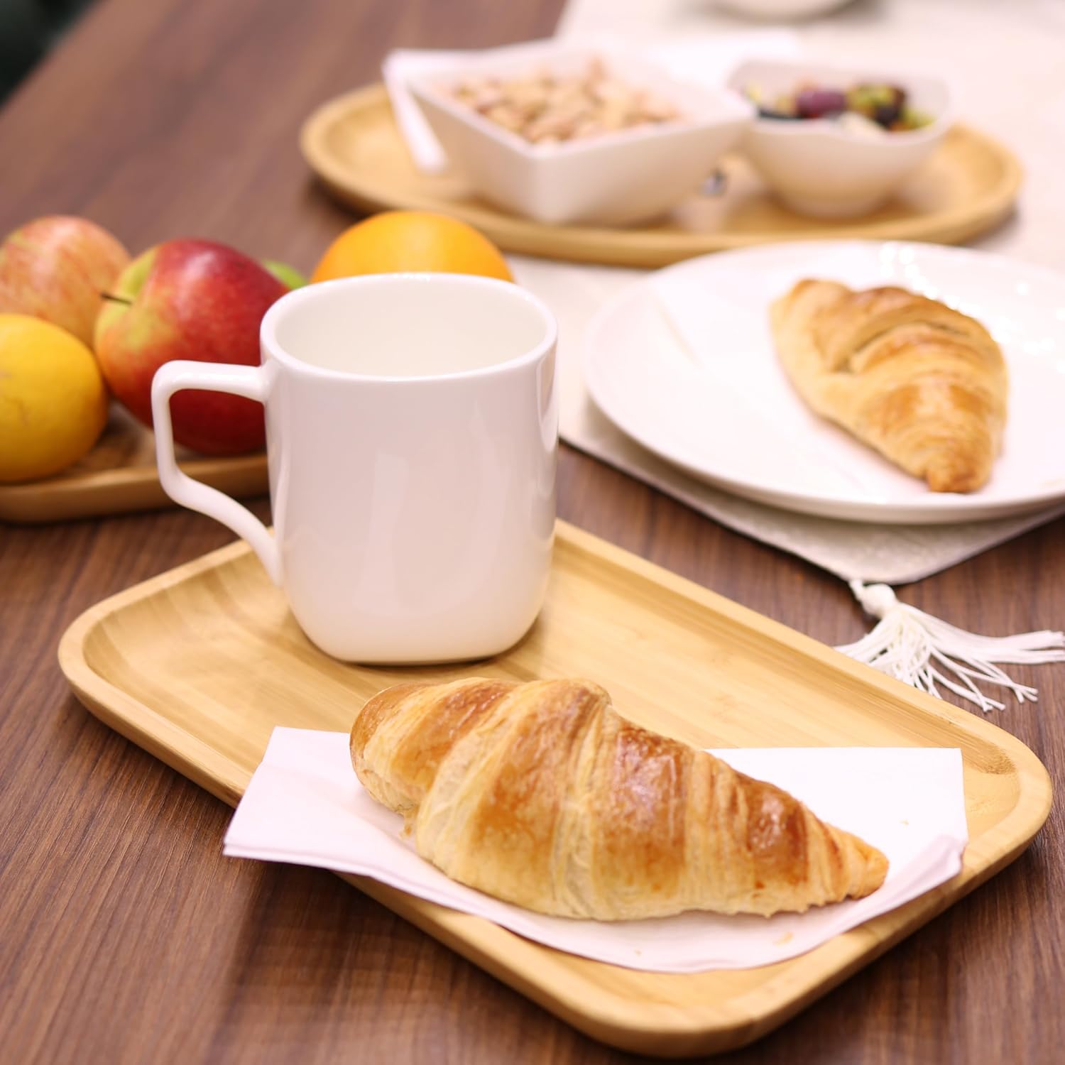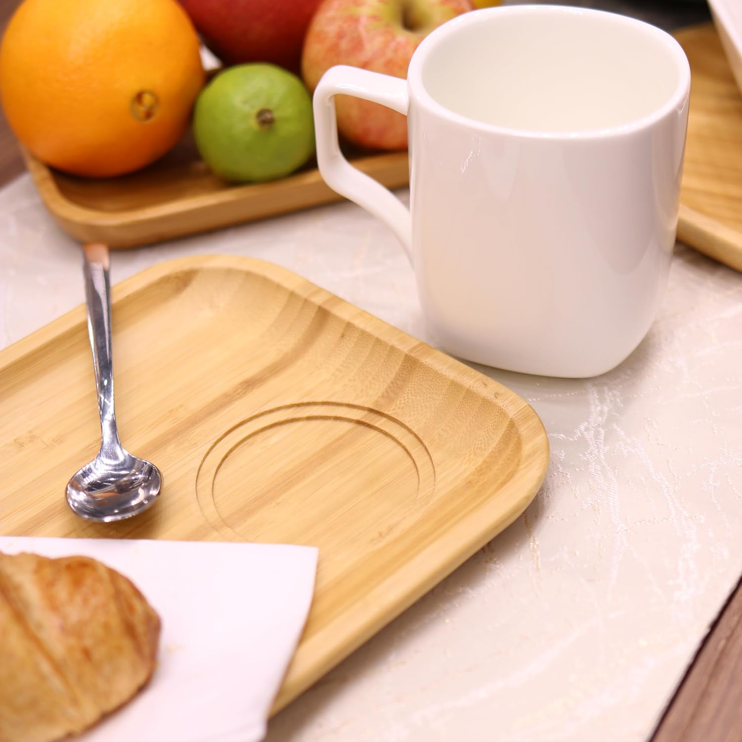 Die Bambusteller zeichnen sich durch ihr nachhaltiges, langlebiges Material aus, während die Tassen mit glasiertem Finish für Alltag und Gästeeinsatz geeignet sind. Das Design ist minimalistisch und zeitlos – passend für moderne wie klassische Tischdekorationen.