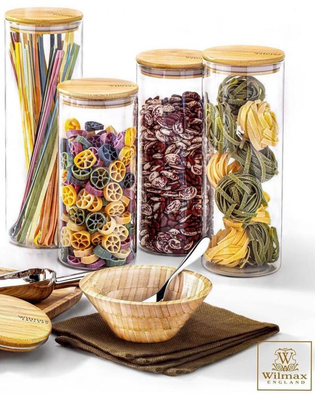 Der Deckel aus natürlichem Bambus ist mit einer Silikondichtung versehen, die für eine luftdichte Lagerung sorgt und Lebensmittel länger frisch hält. Dank der transparenten Glasstruktur lässt sich der Inhalt auf einen Blick erkennen – ideal für die stilvolle und organisierte Aufbewahrung von Lebensmitteln wie Nüsse, Gewürze, Pasta, Marmeladen oder Trockenfrüchte.